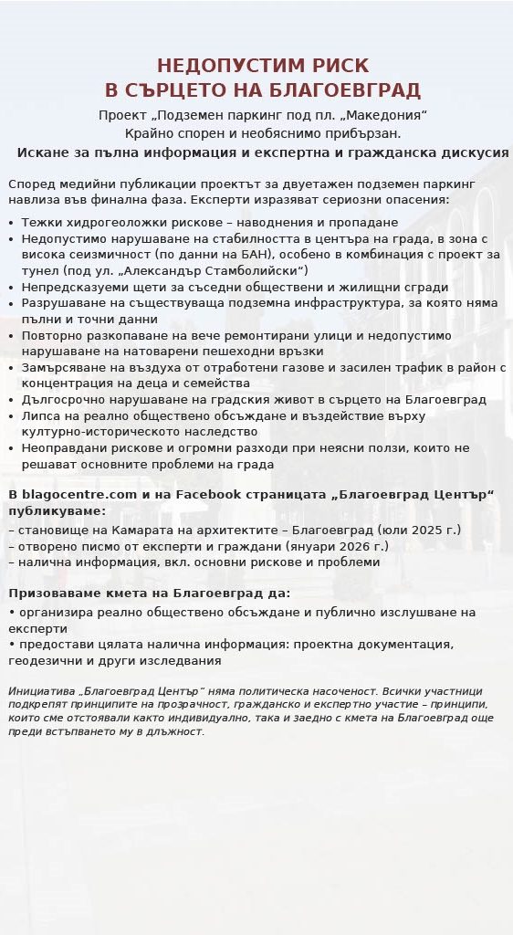 В допълнение към представените рискове и проблеми, едно продължително удължаване на проекта – твърде вероятно с оглед на опита при реконструкции на улиците в Благоевград – ще създаде значително неудобство за гражданите и ще блокира любимо пространство за семейства и деца. Както беше посочено, самите входове към подземния паркинг, дори след реализацията му, представляват грубо нарушение на характера на централната пешеходна зона.