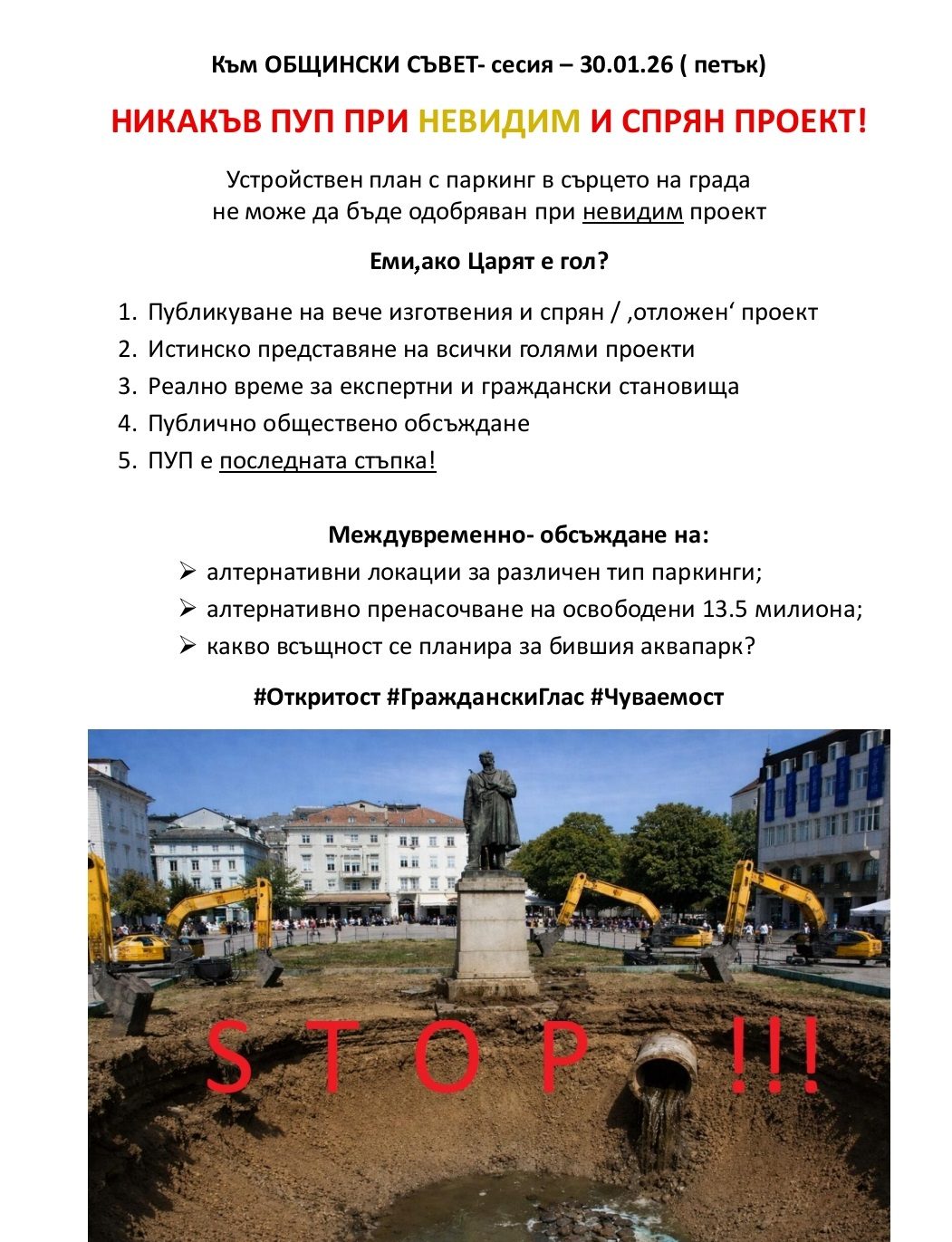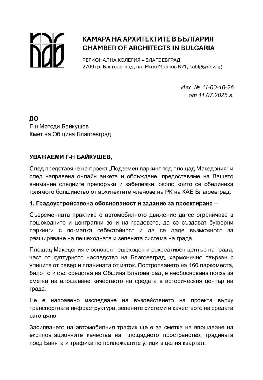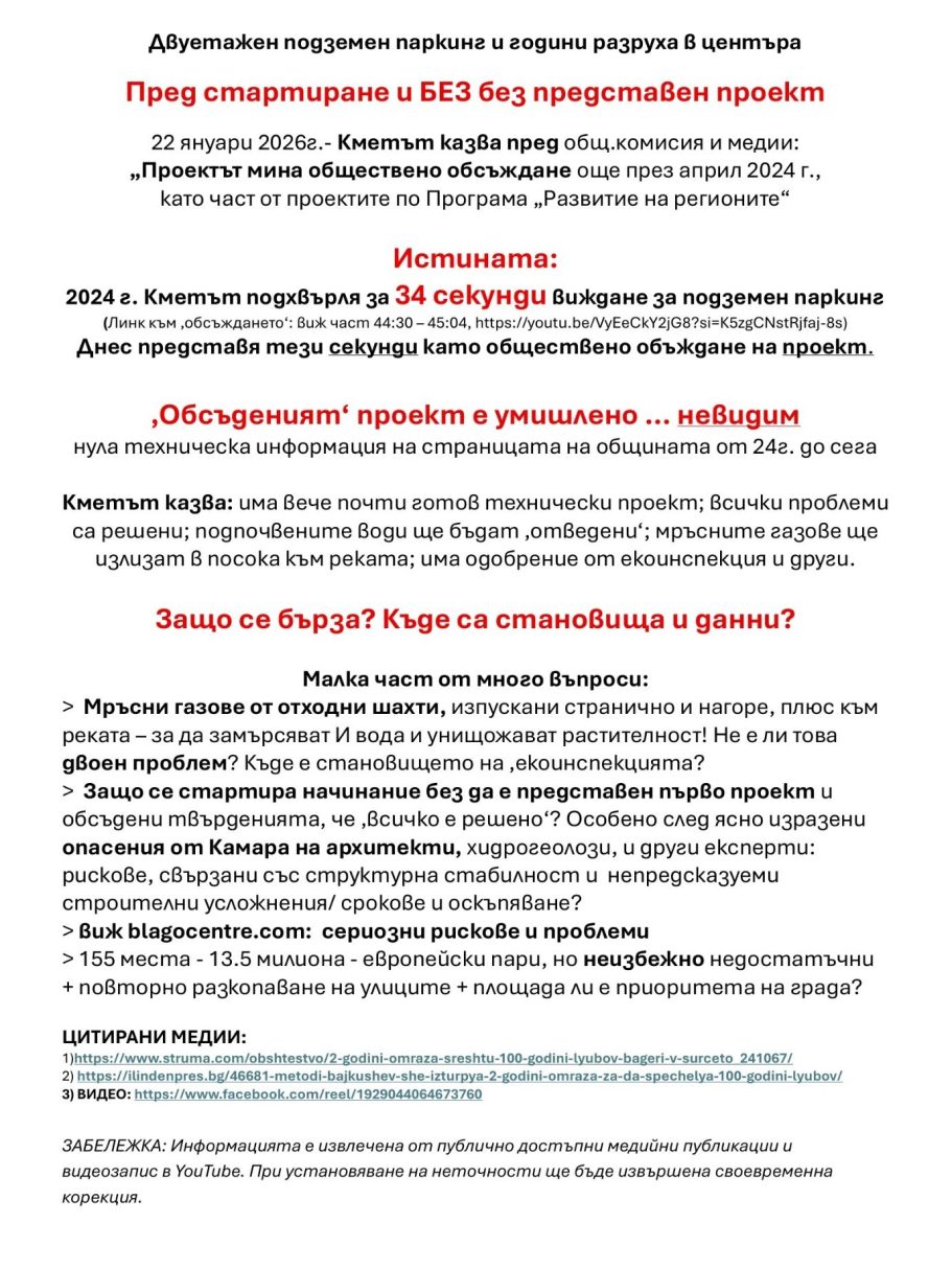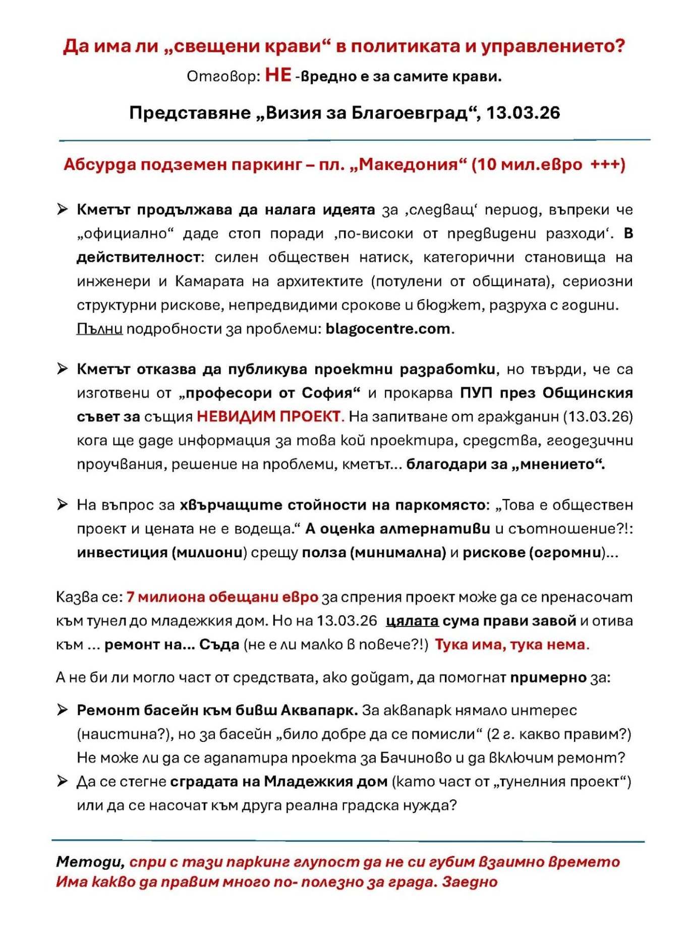 Изграждането на подземен паркинг в сърцето на града е в грубо противоречие с концепцията за Благоевград като зелен и чист град.