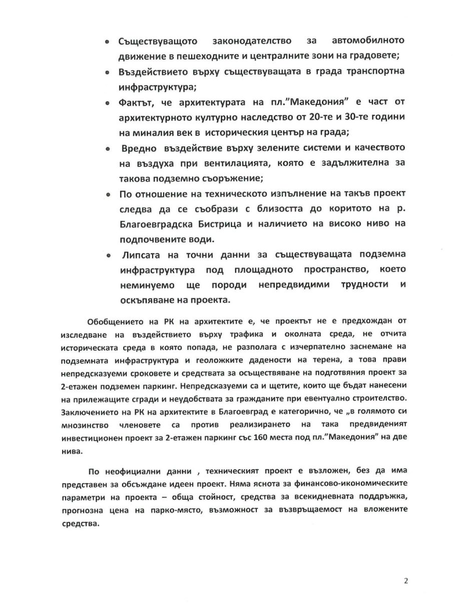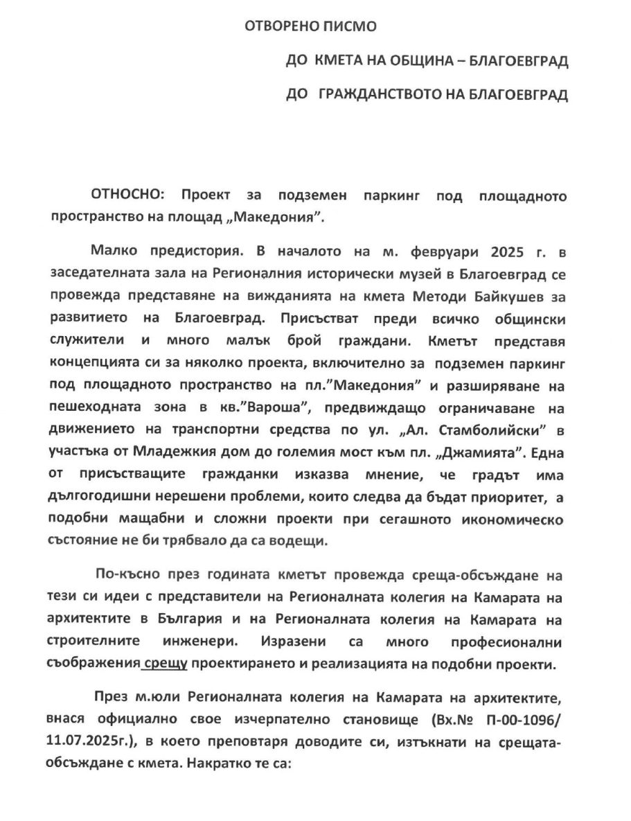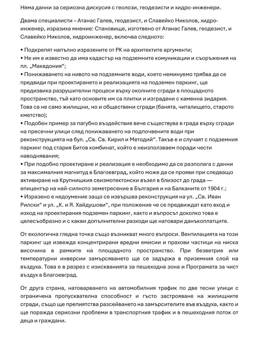 Във връзка с анонсираното в медиите навлизане във „финален стадий“ на проекта за двуетажен подземен паркинг под пл. „Македония“ (155 паркоместа), достигащ ниво под това на река 'Бистрица', и предвидено скъпо строителство и разрушаване на съществуваща инфраструктура, апелирахме към обществеността на Благоевград за изразяване на експертни и лични мнения.