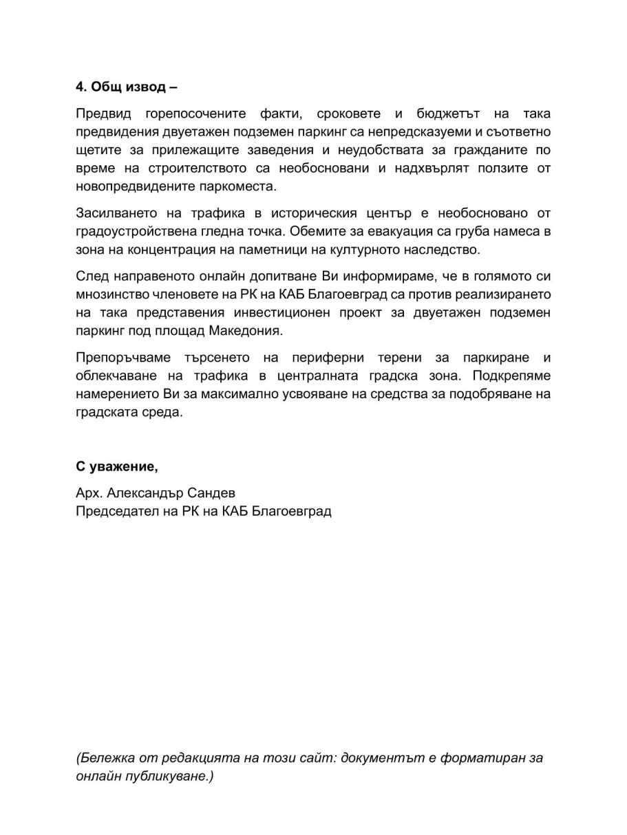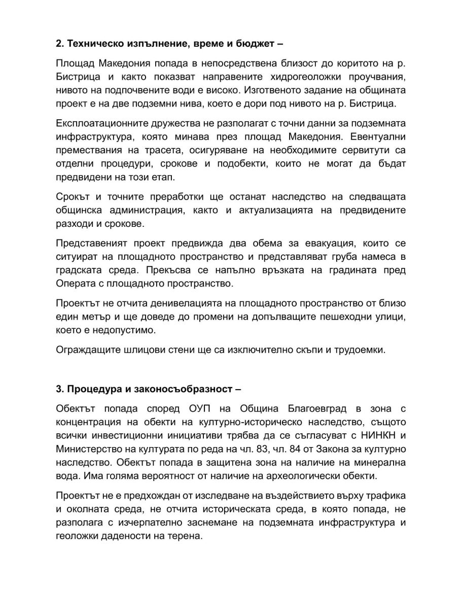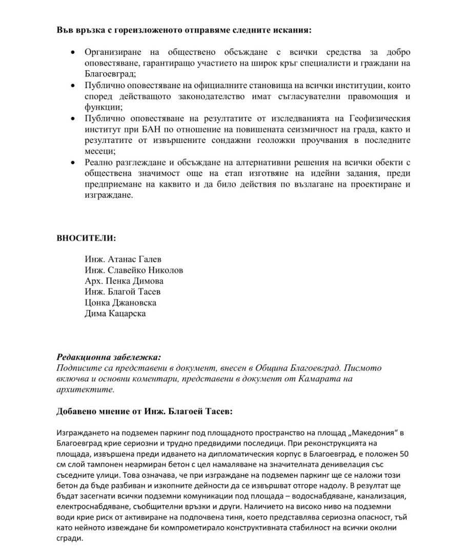 Във връзка с анонсираното в медиите навлизане във „финален стадий“ на проекта за двуетажен подземен паркинг под пл. „Македония“ (155 паркоместа), достигащ ниво под това на река 'Бистрица', и предвидено скъпо строителство и разрушаване на съществуваща инфраструктура, апелирахме към обществеността на Благоевград за изразяване на експертни и лични мнения.