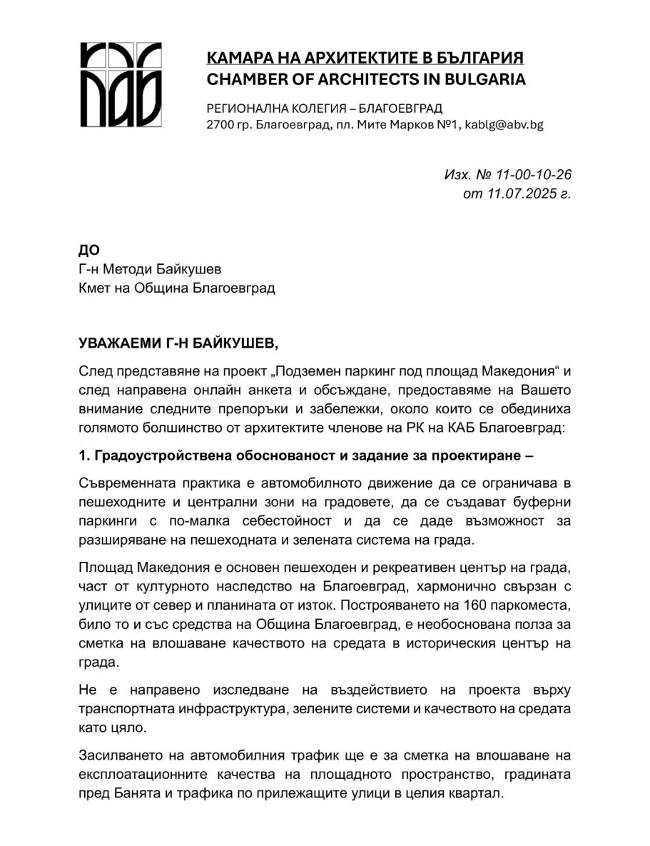 - Становище - Камарата на архитектите – Благоевград; внесено в община 11.07.2025 г. (виж галерия- пълен текст)
